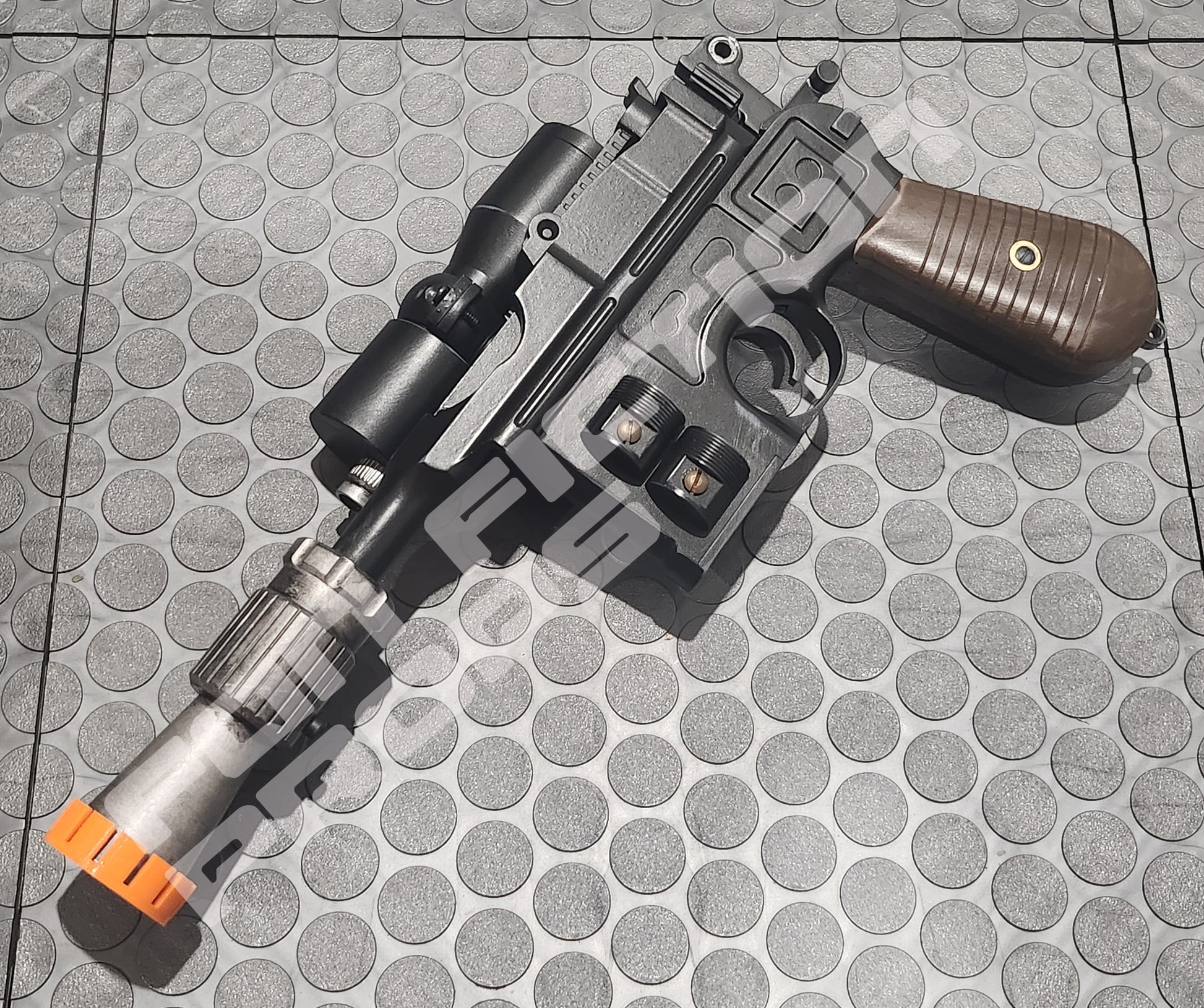 This is a Resin blaster Inspired by the one Han used in SW: ROTJ. These are printed in ABS-Like Resin. Painted and weathered by hand for an authentic look. Trigger and hammer are independently spring loaded. Also features acrylic lenses and metal screws for top scope mount. Barrel has a metal rod glued into model for durability.
