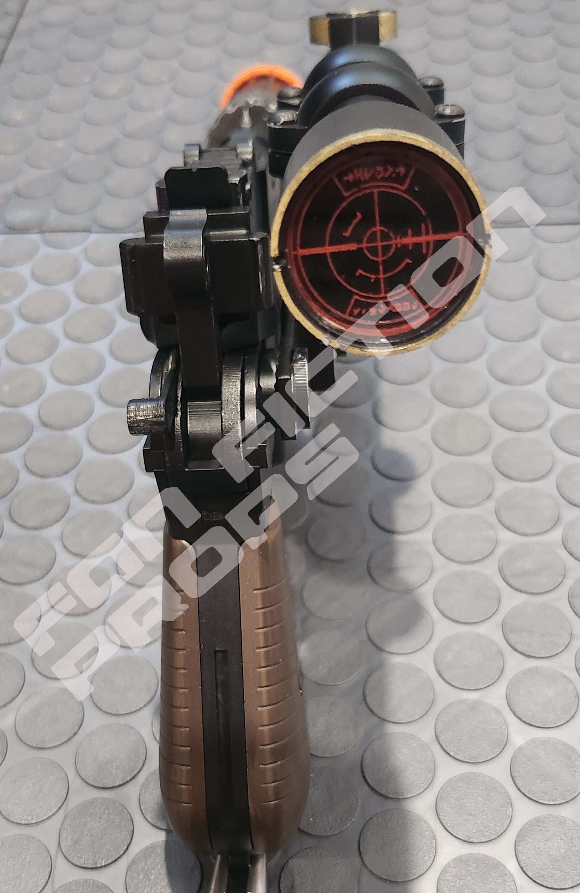 This is a Resin blaster Inspired by the one Han used in SW: TFA. These are printed in ABS-Like Resin. Painted and weathered by hand for an authentic look. Trigger and hammer are independently spring loaded. Also features acrylic lenses and metal screws for top scope mount. Barrel has a metal rod embedded into the model for durability.