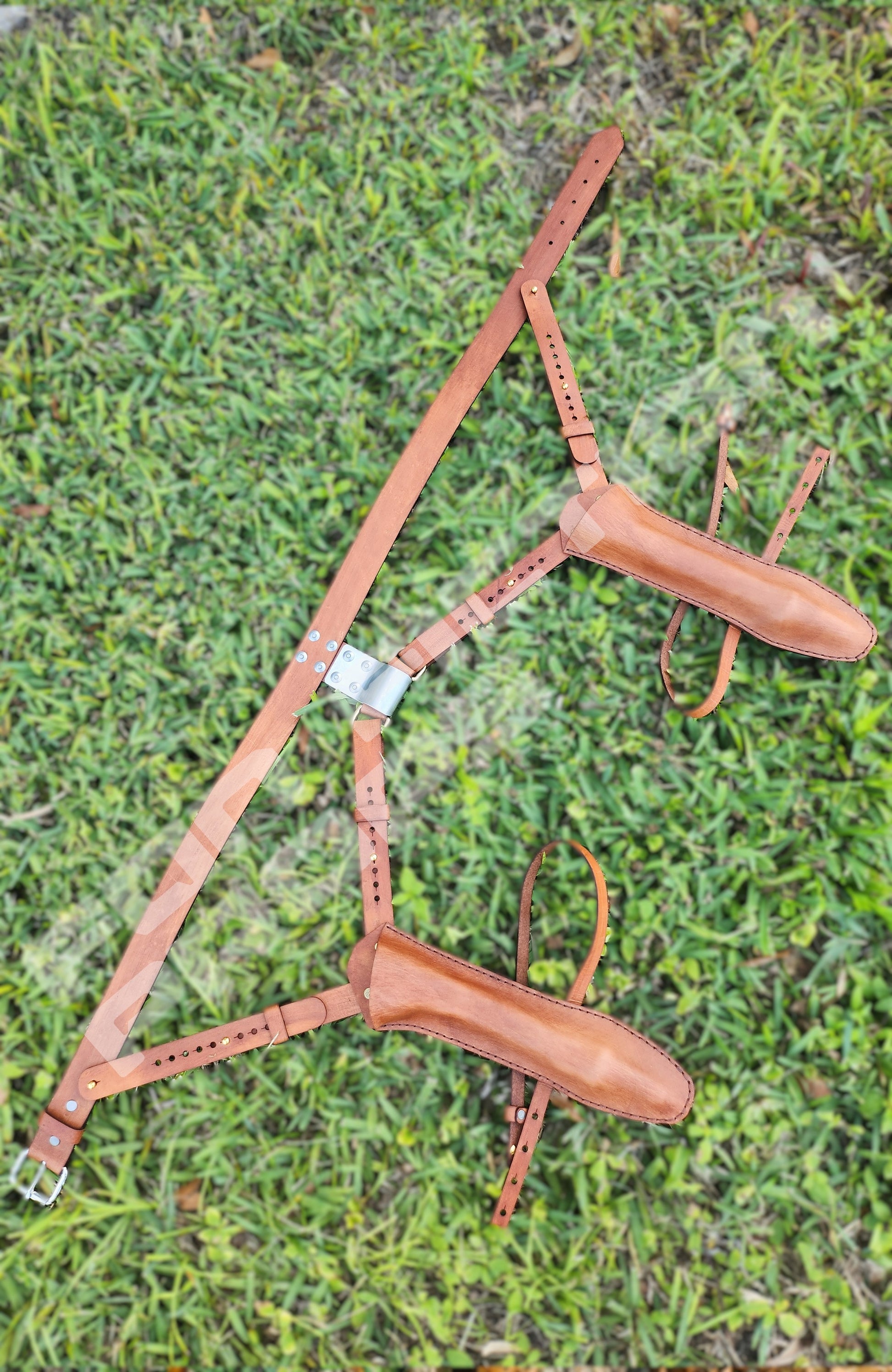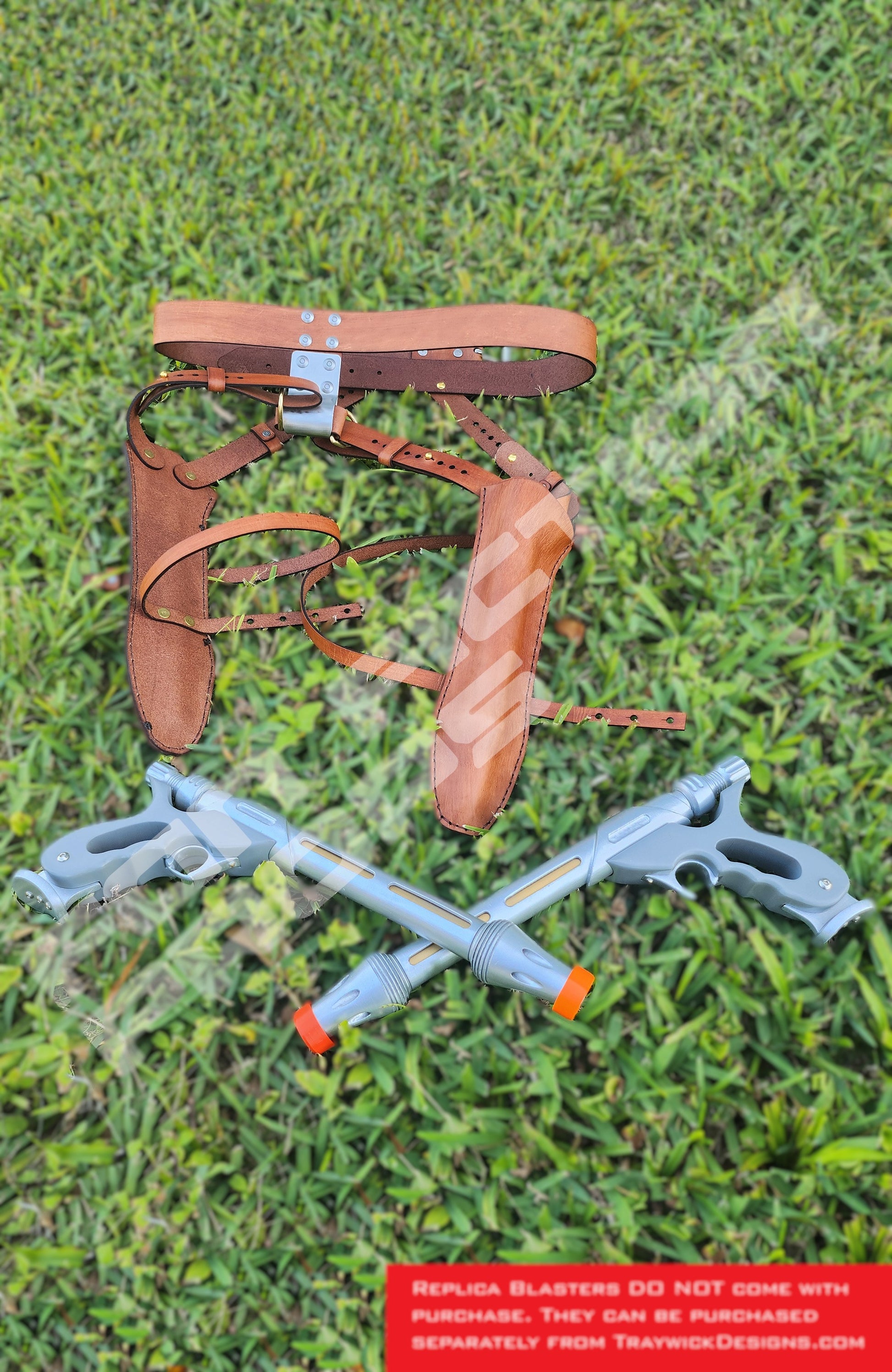 The Traywick Designs replica blasters also fit these holsters perfectly. Drop down buckle/loop that the holsters are held by on the belt is metal and fully adjustable to get the right position under the girth belt. All straps in both front and back for the holsters are also fully adjustable.