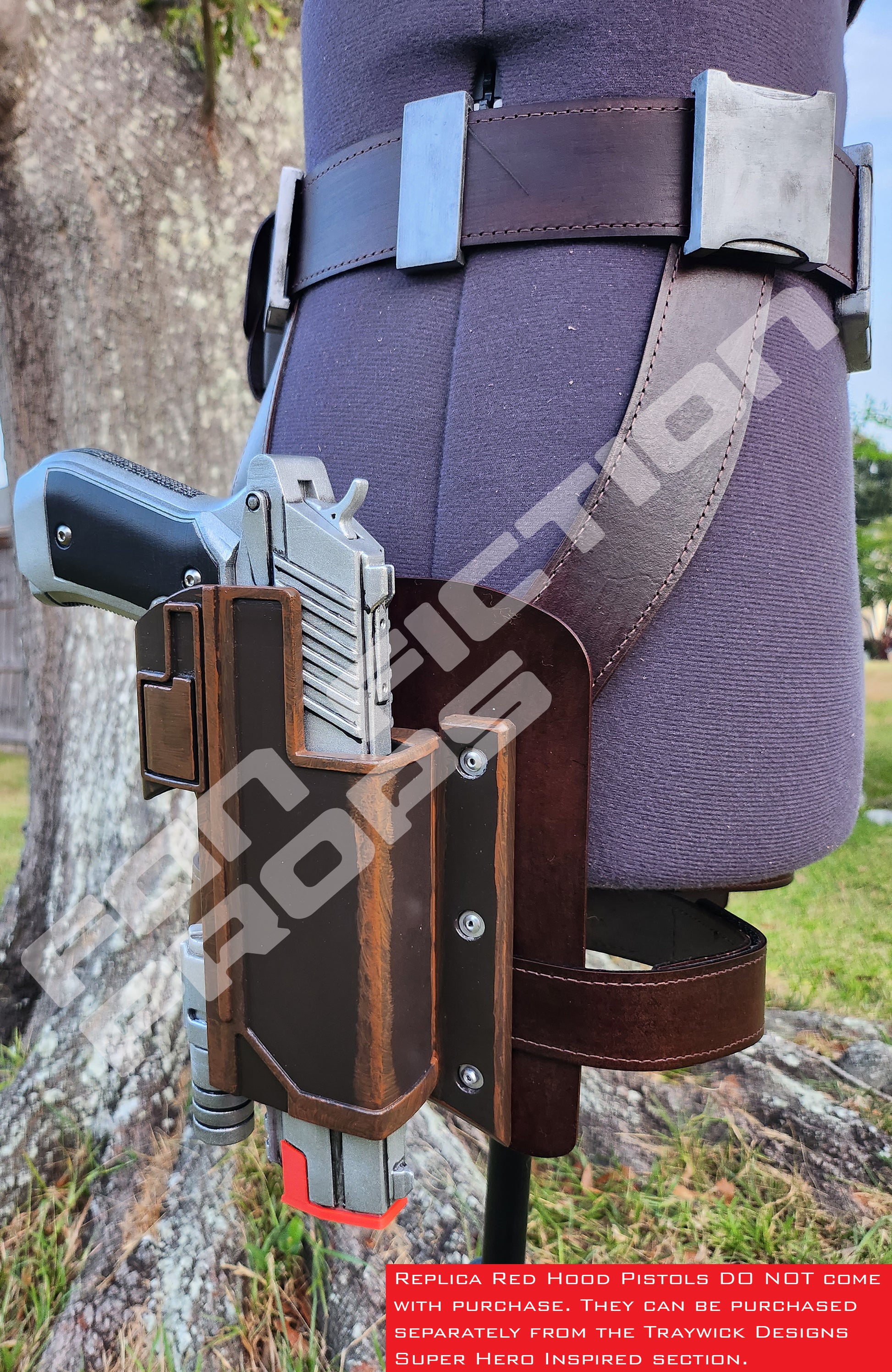 This is a costume belt inspired by the one worn by RH in the Rebirth run. Belt is made of 100% leather, hand dyed and stitched. Buckles and holsters are made of Resin. The holsters are made to fit the custom RH Inspired Rebirth pistols created by TraywickDesigns.com. {These are the only ones I can guarantee will fit.} Belt is adjustable in the back using strong military Velcro. Holster leg straps are also adjustable using Velcro.